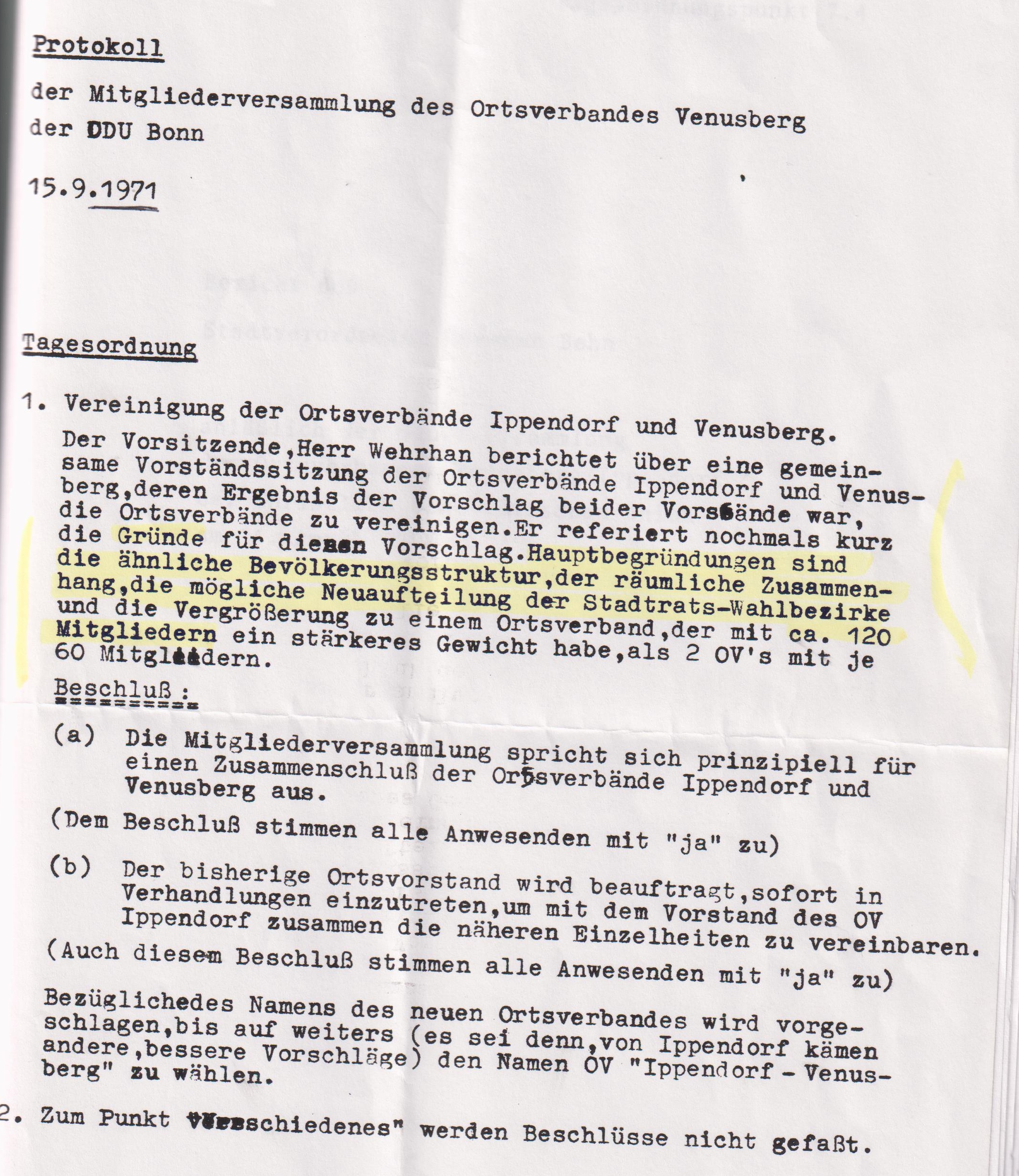 Die Hauptgründe für die Bildung eines gemeinsamen CDU-Ortsverbandes waren u. a. die ähnliche Bevölkerungsstruktur, der räumliche Zusammenhang sowie die bevorstehende Neuschneidung des Wahlkreises für die Kommunalwahl im Jahre 1975. Dieser sollte die beiden Ortsteile Ippendorf und Venusberg umfassen, die bei den vergangenen Kommunalwahlen zum Wahlkreis Röttgen bzw. Poppelsdorf gehörten. Außerdem sollte die Vereinigung von zwei Ortsverbänden mit ca. 120 Mitgliedern (je 60 Mitglieder aus beiden Ortsteilen) ein stärkeres Gewicht haben, um die örtliche CDU somit zu einem schlagkräftigeren Verband zu machen. Die Vereinigung der beiden Ortsverbände hat wesentlich zum Zusammenwachsen der Ortsteile Venusberg und Ippendorf beigetragen.