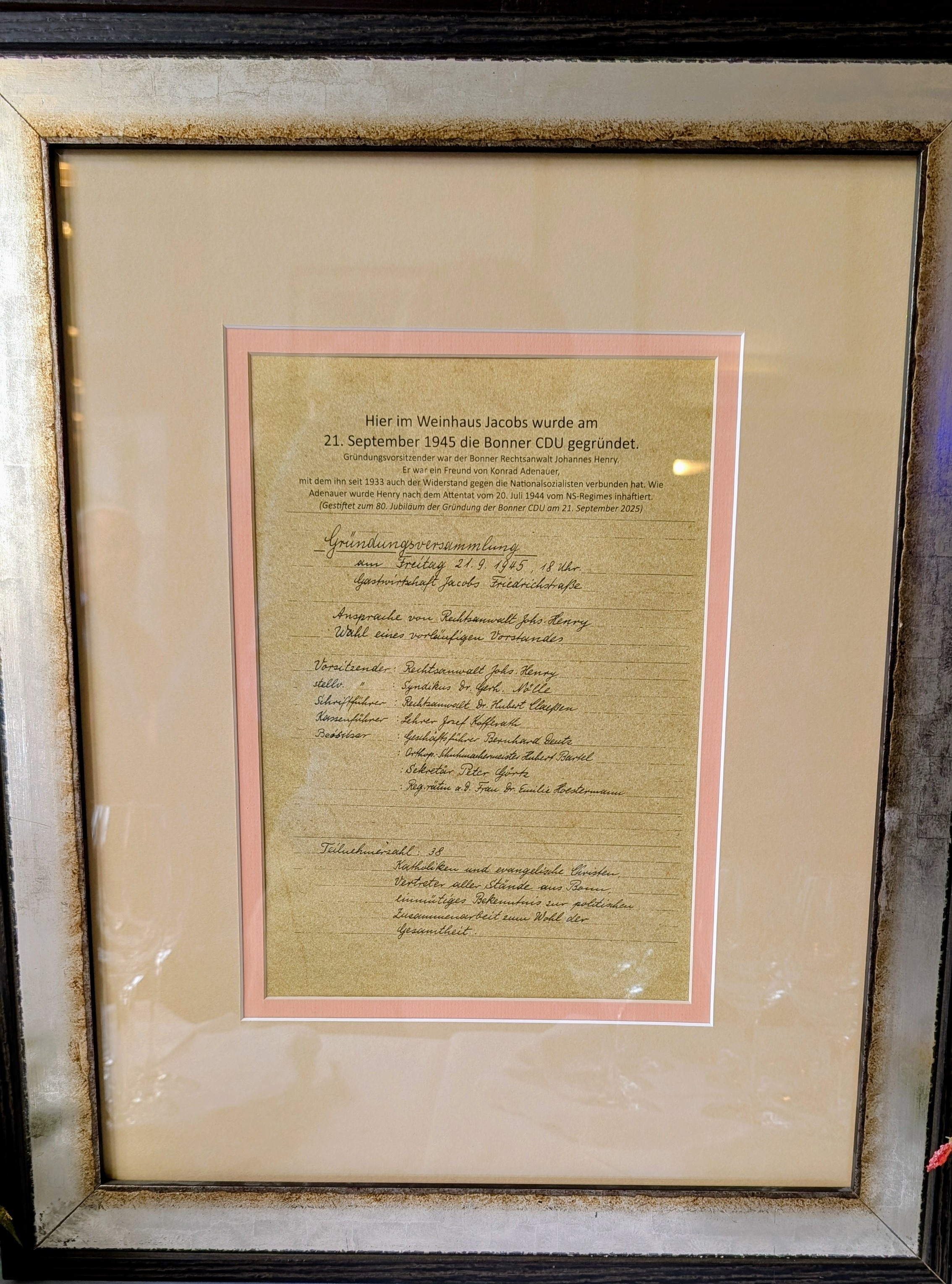 Vor 80 Jahren kamen am 21. September im Weinhaus Jacobs 38 Bonnerinnen und Bonner aus der Stadtgesellschaft zusammen, um eine neue konservative Partei zu gründen. Geprägt von dem Grauen und Schrecken des zweiten Weltkrieges hatten sie den Anspruch eine neue Partei mit christlichem Menschenbild und demokratischen Selbstverständnis zu etablieren. Damit wurde nicht nur der Grundstein für die CDU gelegt, sondern auch ein Meilenstein auf dem Weg zur Bonner Republik erreicht. Bonn wurde zum Ausgangspunkt für den demokratischen Aufbruch in Deutschland. Die Entscheidung zur Westintegration, dem Wiederaufbau und für die Einführung der Sozialen Marktwirtschaft wurde hier in Bonn von der CDU getroffen. Die Werte von Freiheit, Solidarität und Verantwortung, die damals im Mittelpunkt standen, sind bis heute prägend für das politische Handeln der CDU Bonn. Anlässlich dieser Erfolgsgeschichte ist die CDU Bonn am Jahrestag zum Ort des Geschehens zurückgekehrt, um mit einer kleinen Feierstunde und einem Replikat des Protokolls der Gründungsversammlung an die Stunden der Gründung zu gedenken.
