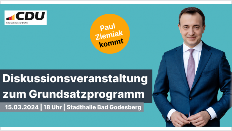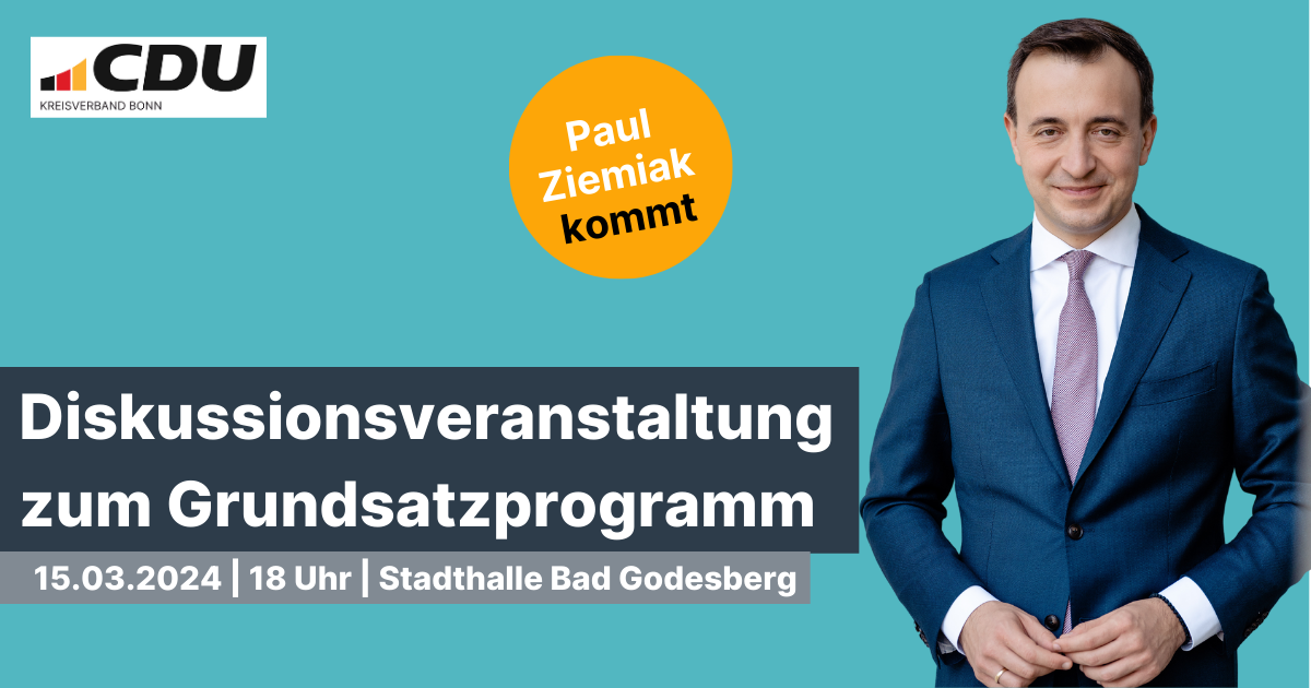 Am 15. März 2024 um 18 Uhr möchten wir gemeinsam mit Ihnen und mit unserem NRW-Generalsekretär Paul Ziemiak über das Grundsatzprogramm in der Stadthalle Bad Godesberg (Koblenzer Str. 80, 53177 Bonn) diskutieren.